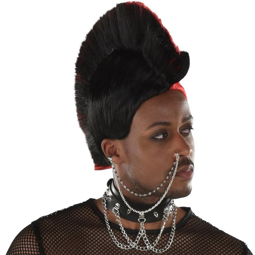 Perfect your Halloween or cosplay look with this half black, half red wig. The synthetic hairs stand straight up in a classic punk rock style.