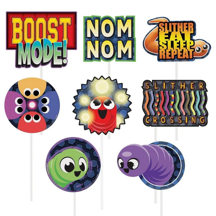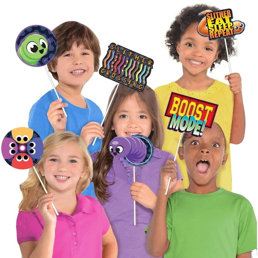Slither.io Photo Booth Props make for a fun and safe party activity! Each photo prop features a colorful cardstock cutout attached to a long plastic stick. There’s several unique designs, including colorful snakes and fun headlines like “Slither, Eat, Sleep, Repeat.” Add these cardstock props to their video game birthday party or Slither.io party so all the little ones can take fun and adorable selfies!