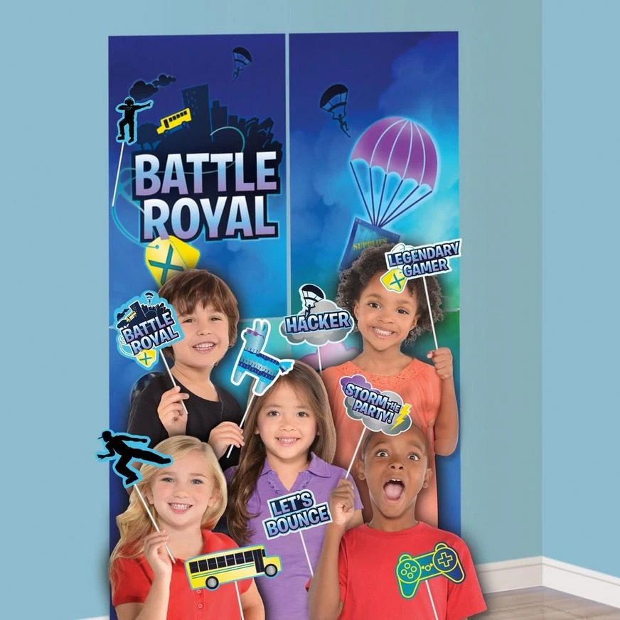 Guests at your child’s birthday party can take pictures with dancers, skydivers, and headlines like “Legendary Gamer” when you set up a Battle Royal Scene Setter with Photo Booth Props! The scene setter features a game controller, llama pinata, supply box, and more on a blue background. Everybody will have a blast posing for pictures with this Battle Royal scene setter set!