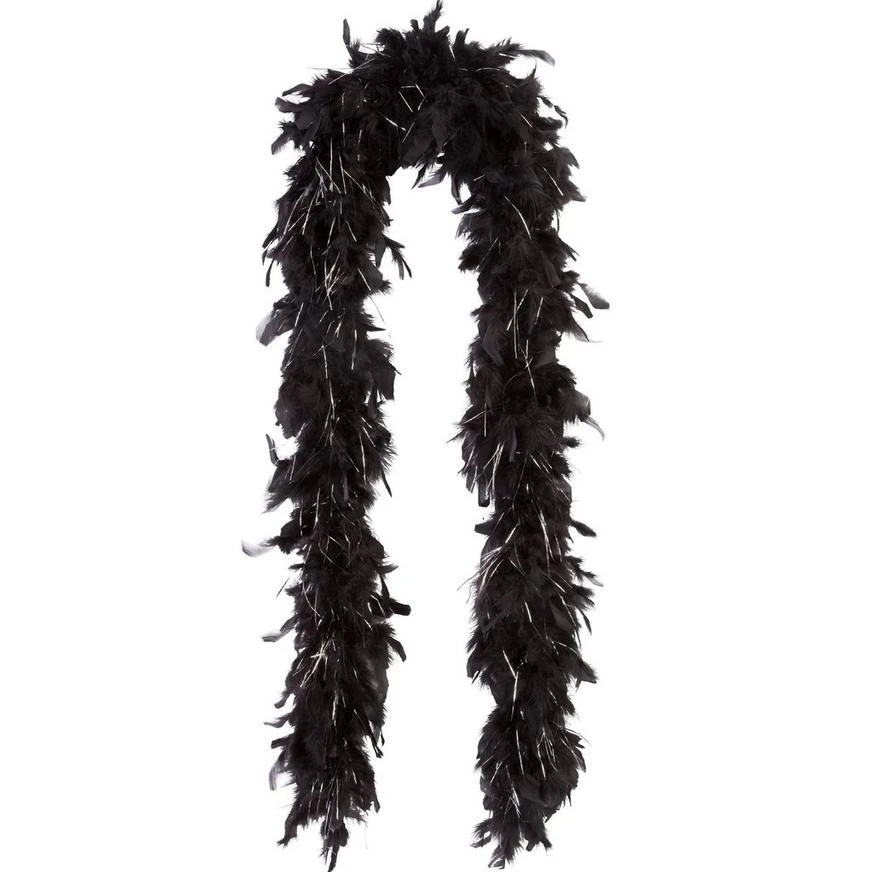 Wrap yourself in glamour with our Black with Silver Tinsel Feather Boa. This black feather boa features strands of silver tinsel to give a little sparkle to a traditional feather boa. This feather boa is the perfect finishing touch to a burlesque costume or a fun accessory to wear to a parade. Black with Silver Tinsel Feather Boa measures 72in.