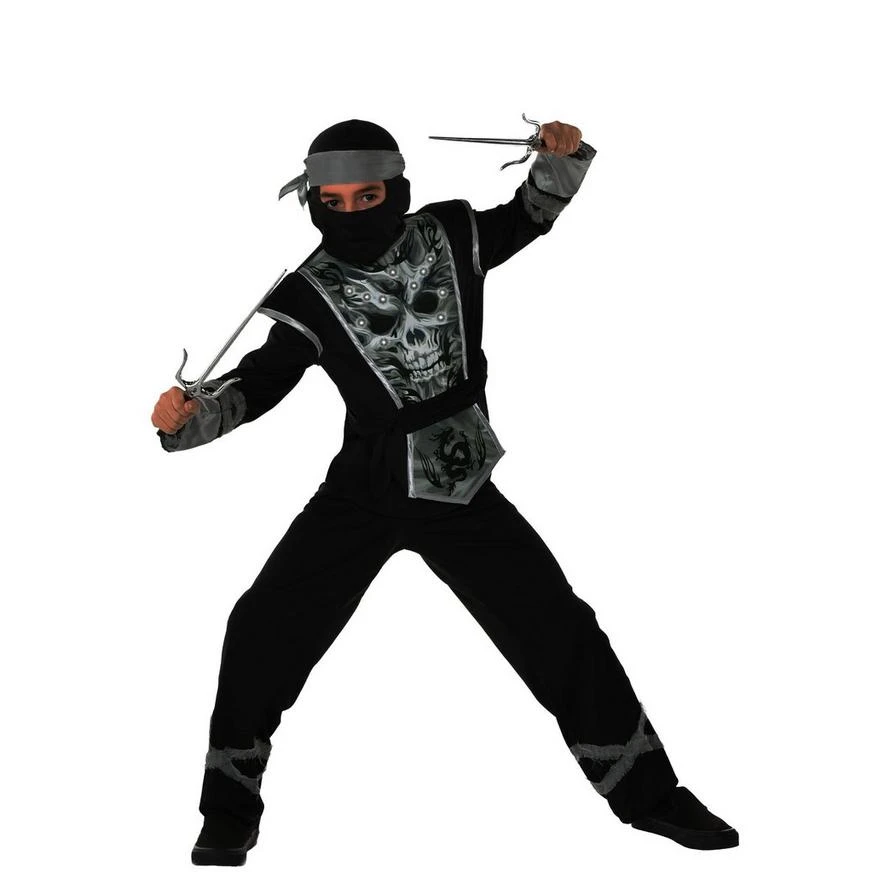 They’re a stealthy and lethal fighter in this Light-Up Skeleton Ninja Costume for kids. This ninja costume features a black long-sleeve top with an attached tabard, an attached belt, and built-in lights in the skull print on front. Add the matching black pants, silver headscarf, and black face mask to complete their mysterious look.