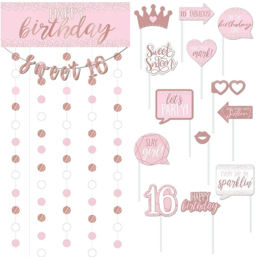 Everybody at the birthday party will be ready to snap some selfies when you have a Glitter Gold & Pink Sweet 16 Photo Booth Kit! This kit includes a backdrop set that reads “Happy Birthday Sweet 16” with five strings of circle cutouts hung from the bottom. The kit also includes metallic gold, pink, and black photo props with designs like tiaras, lips, and heart-shaped glasses. Use this photo booth kit to capture precious memories from their special day.