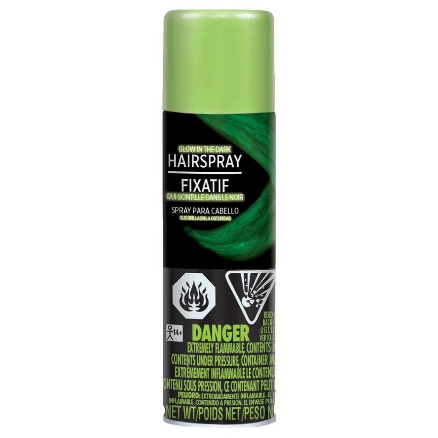 Funkify your look with Glow-in-the-Dark Hair Spray! Apply to your styled ‘do for school events, costumes, or any nighttime event. Either way, you’ll make a bold statement with glow-in-the-dark hair. Easily wash out this non-damaging aerosol hair spray with shampoo and water, but not before turning off the lights and watching it glow!