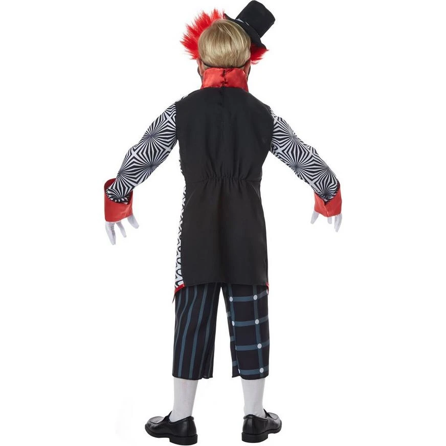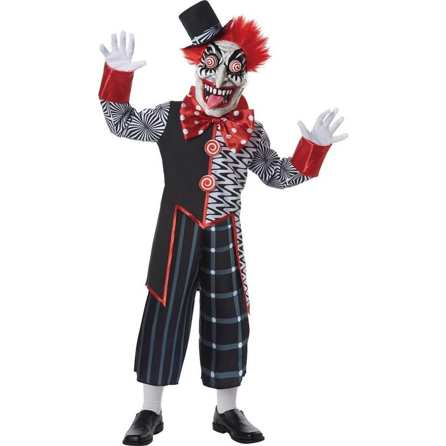 Part circus master, part clown of your nightmares, this Krazy Klown costume for kids is sure to scare everyone when they go out trick-or-treating. The black, red, and white shirt and pants have so many fun house patterns and a giant polka dot bow tie. The matching mask has scary makeup, spiral googly eyes, and a red wig. Top off the look with the tiny top hat and white gloves.