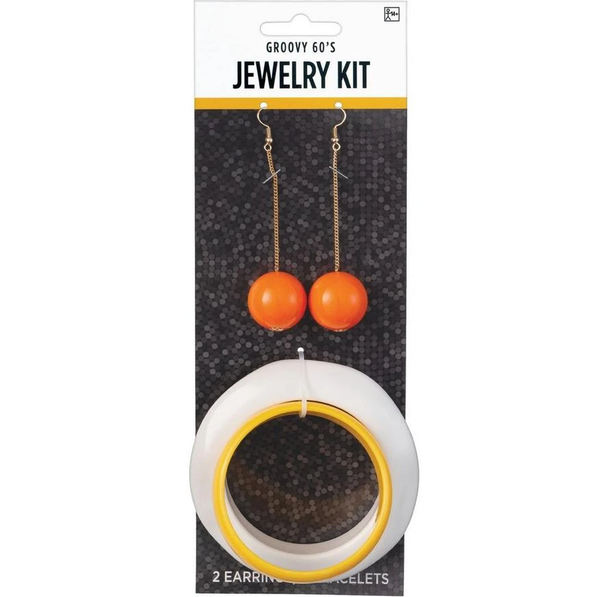 Add some groovy 60s style to your costume with the Mod Jewelry Set! Inspired by 60s Mod fashion, this jewelry set includes earrings featuring orange balls hanging from gold chains, one yellow, round bracelet, and one white, irregularly shaped bracelet. Pair these pieces with colorful Mod miniskirt and your groovy 60s look is complete!