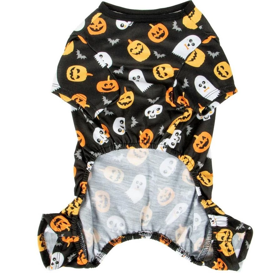 Your fur baby will be sweet and spooky wearing this adorable Halloween onesie! The black outfit is decorated with a pumpkin, bat, ghost, and skeleton pattern and fits over front and back legs.