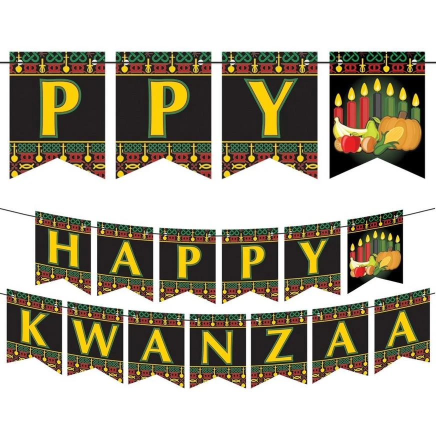 Create an eye-catching backdrop for pictures and decorate your party space with a Kwanzaa banner. The hanging decoration has 13 pennant flags that read “Happy Kwanzaa” in gold on a black, green, and red background. Hang it on a wall, table, or mantel to complete your display.