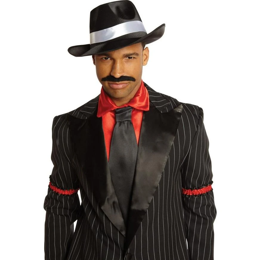 Look your level best for all those police surveillance photos. This Satin Band Gangster Hat is a black press-formed fabric fedora with deep indentations in the crown. The subtly contrasting black felt brim is upturned in back and reinforced with faux leather edging. A striking white satin hatband gives this jaunty gangster hat its name.