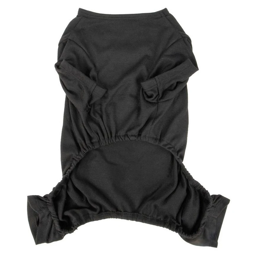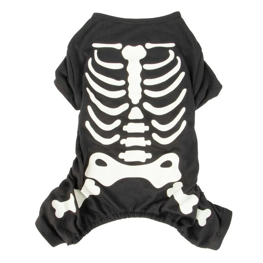 Your fur baby will be cozy and creepy wearing this adorable Halloween one piece. The black outfit goes onto front and back legs and has a white skeleton along the back mimicking your doggie’s skeleton!
