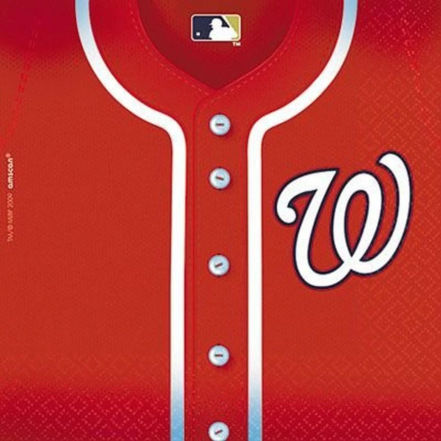 Washington Nationals Lunch Napkins protect your game day outfit from ketchup and crumbs! These 2-ply paper napkins are printed to look like an official team jersey with MLB and Nationals logos. Keep a stack on your table at your baseball-themed party.