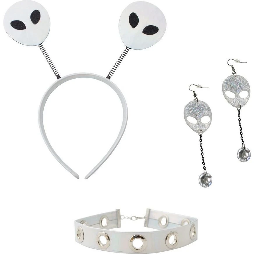 An Alien Costume Accessory Kit has everything you need to dress up and party with earthlings! This costume accessory kit includes a headbopper with attached alien head cutouts, alien head earrings with attached rhinestones, and a white and silver choker. Dress up as an alien with these accessories and you’ll be ready to arrive to the costume party in a UFO!